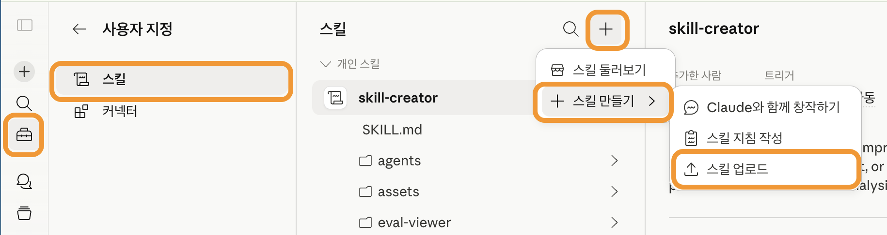 사용자 지정 → 스킬 → 스킬 만들기 → 스킬 업로드 → blog-writter.zip 선택