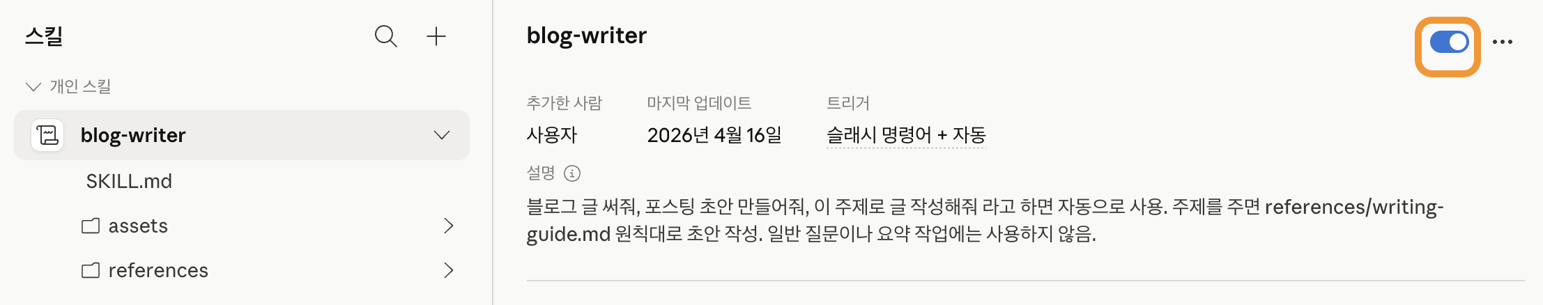 목록에 blog-writter 스킬이 나타나면 토글을 켜고,