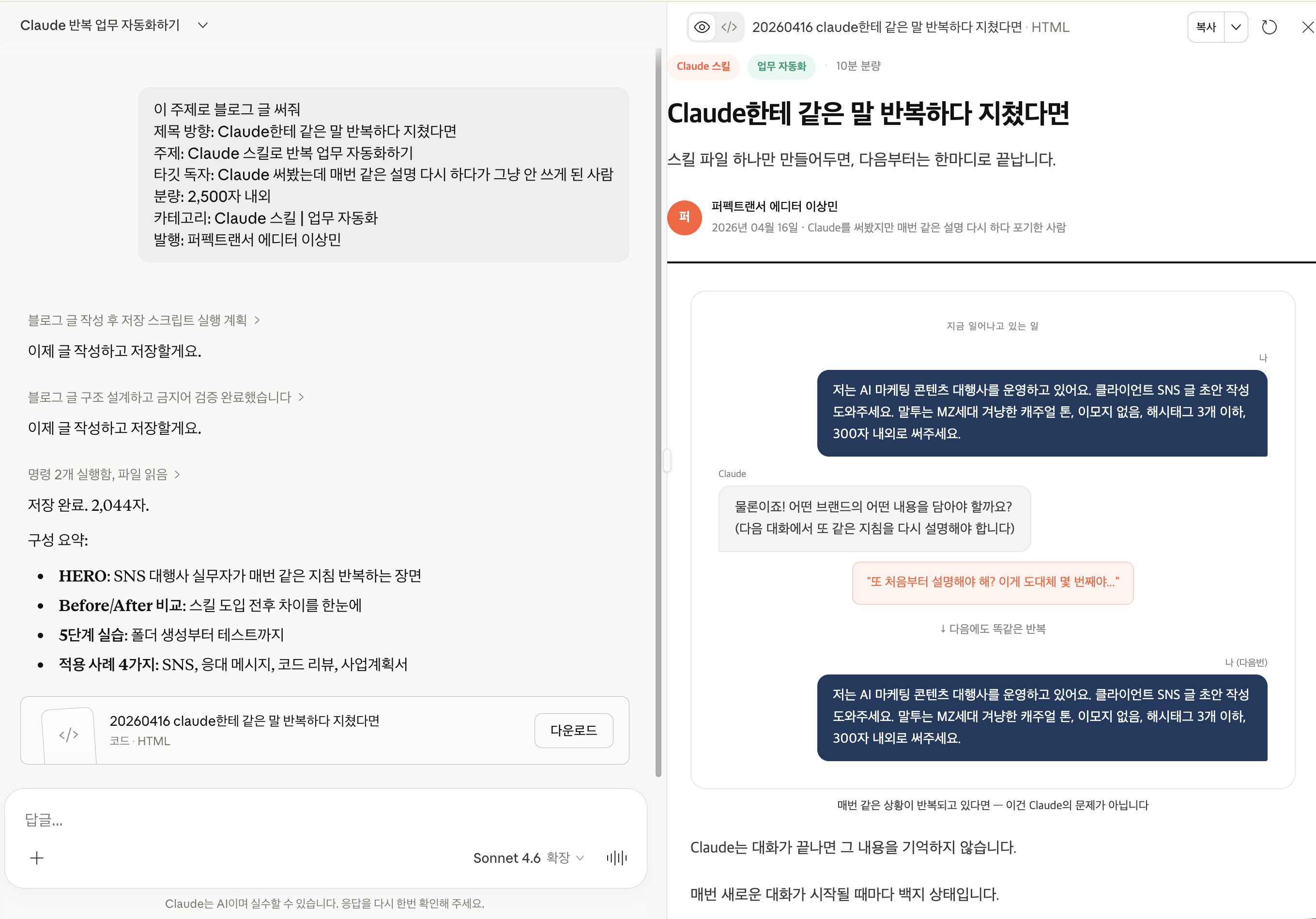 4. 짜잔~ 이제 Claude가 스킬을 자동으로 감지해 블로그 글이 생성됩니다.